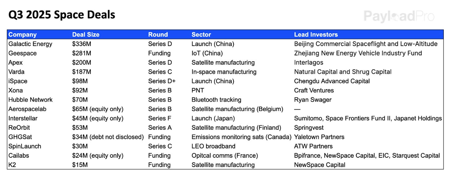 This quarter saw China emerge as a major funding driver, with Galactic Energy raising $336 million in its Series D round —the largest ever for a Chinese launch startup. Geespace secured $281 million for its IoT satellite mega-constellation, and innovators like iSpace and Galactic Energy are gearing up for end-of-year tests on reusable launch vehicles that promise to slash costs and crank up launch cadences.