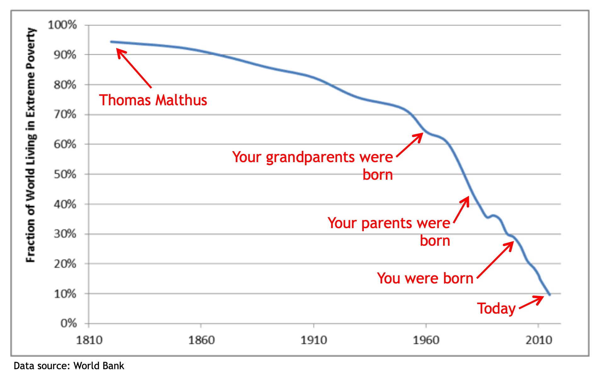 In 1800, 90% of mankind was in extreme poverty — today, less than 10%. In just 100 years, global GDP per capita has increased by nearly an order of magnitude.